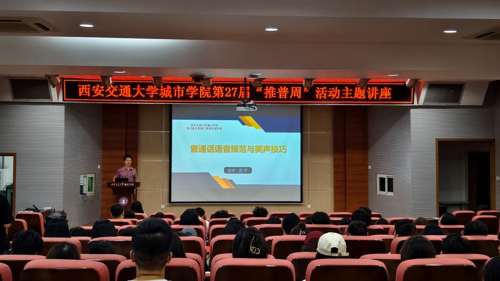 高宇为学校师生作题为“普通话语音规范与美声技巧”的专题讲座,他从普通话语音规范、科学发声和声音美化技巧方面,帮助师生规范发声、科学用嗓。讲座紧密结合陕西语言特点和师生常见问题,深入浅出地介绍了普通话基础知识和发音技巧,提升师生规范使用普通话的意识和能力,带领师生领略普通话语音的魅力。讲座内容丰富、活泼生动、互动热烈,良好效果。