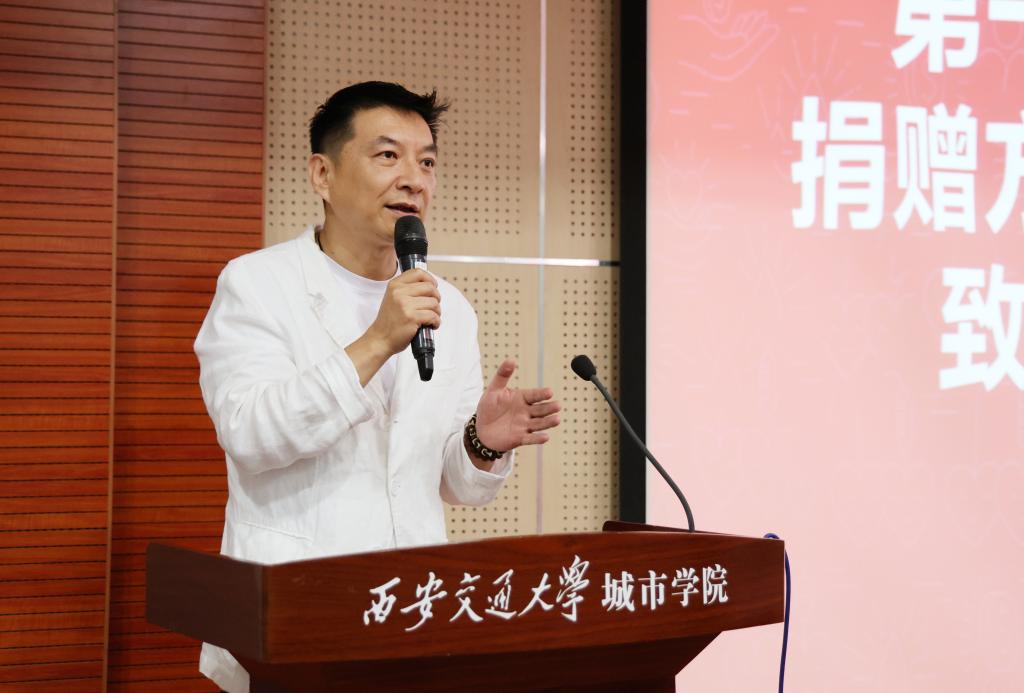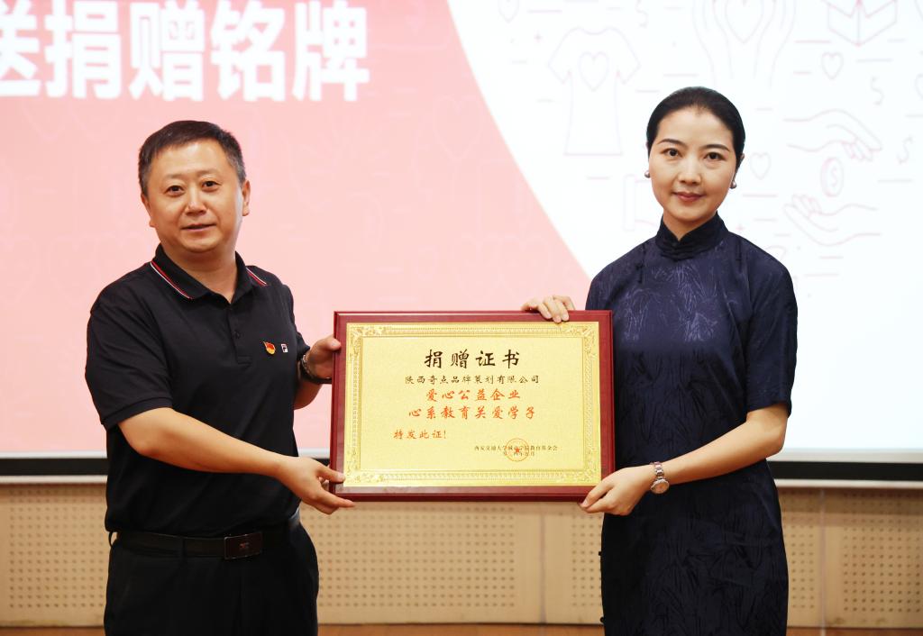 在捐赠仪式上,吕越涛介绍了公司的基本情况和未来发展愿景。他表示,此次会议的召开将是双方合作共赢、创新发展的新起点。今后,双方将以此为契机,积极探索高等学校与陕西奇点品牌策划有限公司的产学研合作新模式,实现人才、信息资源共享,共同推动文化产业的不断发展。解安宁教授向捐赠方关爱学子、心系教育的慷慨之举表示感谢。他对艺术与设计学院进行了介绍并表示全院师生在今后的工作、学习中,将用积极向上的学习态度和优异的成绩回报爱心企业、回馈社会。学生工作处处长兼教育基金会秘书长辛红伟代表基金会接受捐赠,并向捐赠方授予捐赠铭牌。