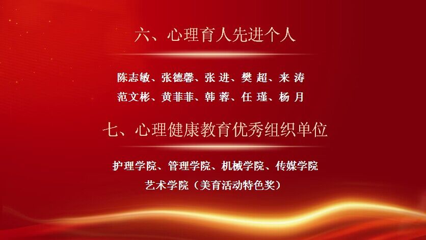 情景剧结束之后,学生处姚敏副处长宣读了《关于表彰第十六届心理健康教育活动季优秀组织单位和个人的决定》。为进一步做好心理育人工作,我校于3-6月举办了第十六届“阳光护航”心理育人宣传季系列活动。本届活动季组织开展了心理游园会、主题征文活动、心理趣味运动会、心理情景剧、团体辅导等活动,普及了心理健康知识,提升了学生的心理素养。在活动季中涌现出了一批表现突出的集体和个人。与会领导对第十六届宣传季优秀个人及集体进行了表彰。