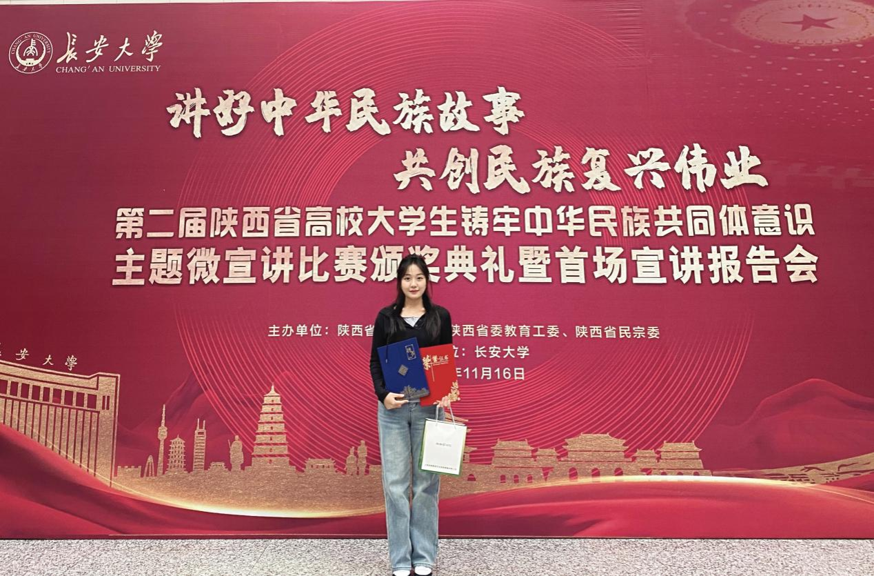 近日,在第二届陕西省高校大学生铸牢中华民族共同体意识主题微宣讲比赛中,我校传媒学院张雅琪同学的参赛作品《民族之声回响,共绘复兴蓝图》获三等奖,成为同类院校中唯一获奖的参赛作品。